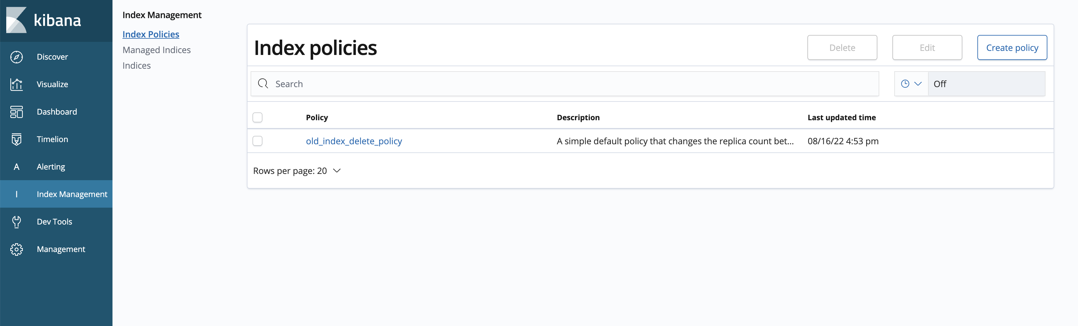 kibana 좌측 사이드바에서 index 관리 정책을 설정할 수 있습니다.