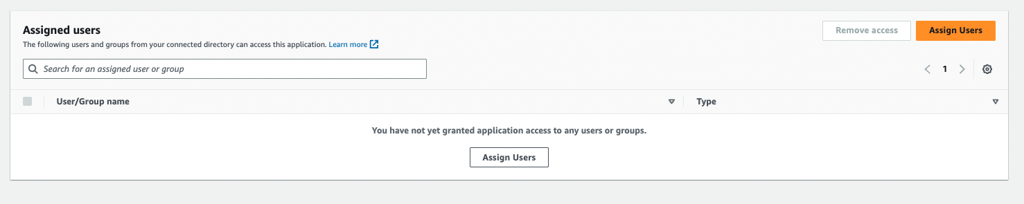 해당 aws sso custom application을 이용할 user를 할당해줍니다. 저의 경우는 active directory를 기반으로 하여 연동하였으나 사용가능한 어떠한 user pool이든 할당해주시면 됩니다.