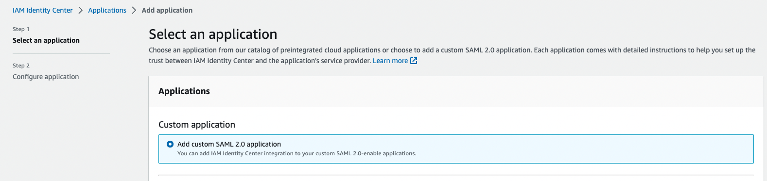 Add custom SAML 2.0 application을 선택한 후 next 버튼을 클릭합니다.