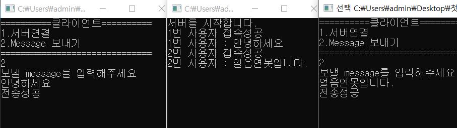 각각의 클라이언트가 보낸 메시지를 콘솔에 출력해주고 있습니다.